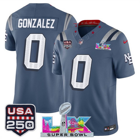 Men New England Patriots 0 Christian Gonzalez Storm Blue 2025 F U S E Super Bowl LX USA 250 Patch Rivalries Vapor Limited Football Stitched Jersey