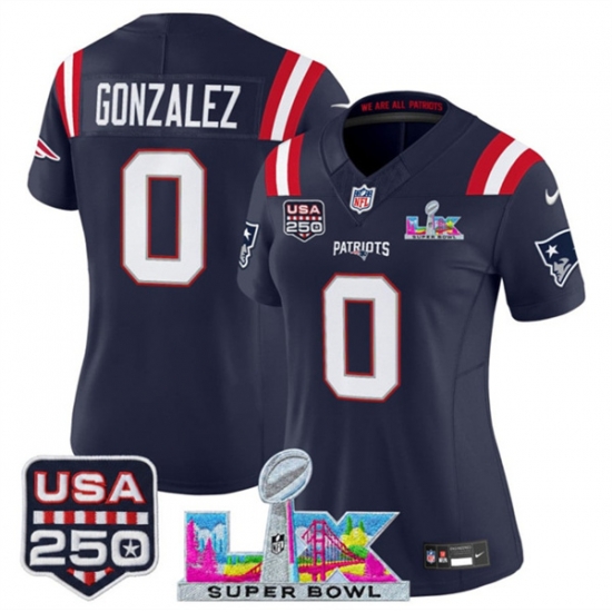 Home>NFL>2025 2026 Super Bowl LX>New England Patriots>Women New England Patriots 0 Christian Gonzalez Navy 2025 F U S E Super Bowl LX Patch And USA 250 27 Patch Vapor Limited Football Stitched Jersey