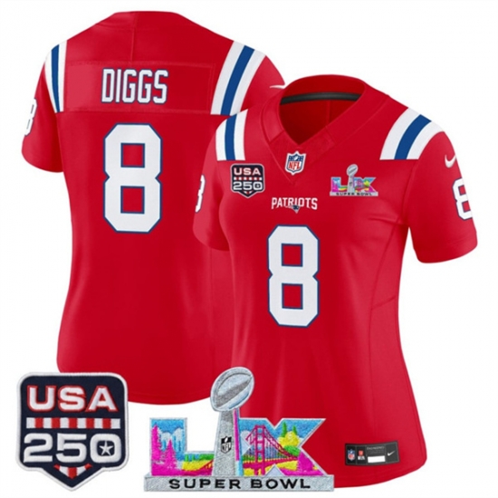 Women New England Patriots 8 Stefon Diggs Red 2025 F U S E Super Bowl LX Patch And USA 250 27 Patch Vapor Limited Football Stitched Jersey