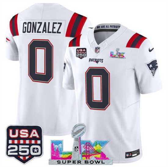 Home>NFL>2025 2026 Super Bowl LX>New England Patriots>Youth New England Patriots 0 Christian Gonzalez White 2025 F U S E Super Bowl LX Patch And USA 250 27 Patch Vapor Limited Stitched Football Jersey